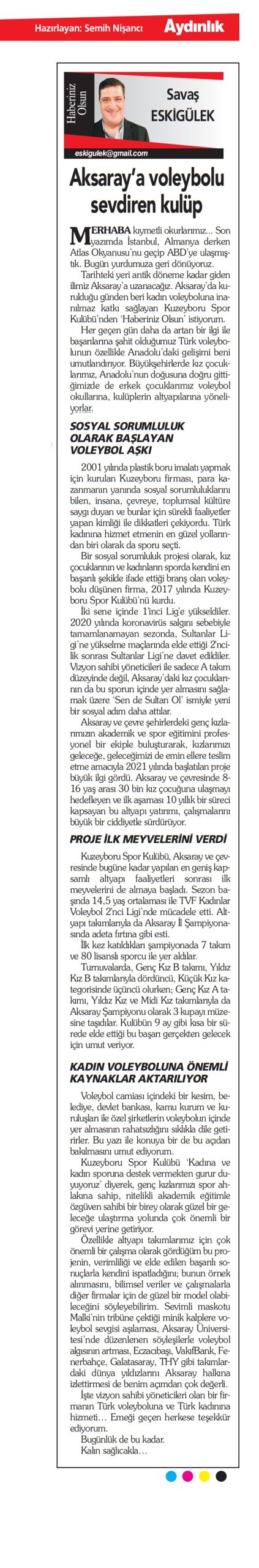 Sitemizin köşe yazarı Savaş Eskigülek, “Aksaray’a voleybolu sevdiren kulüp” başlıklı köşe yazısıyla sizlerle.