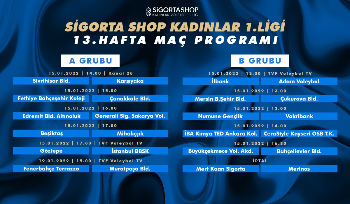 | 15 Ocak Cumartesi | 13.00 | İlbank – Adam Voleybol | TVF Voleybol TV |