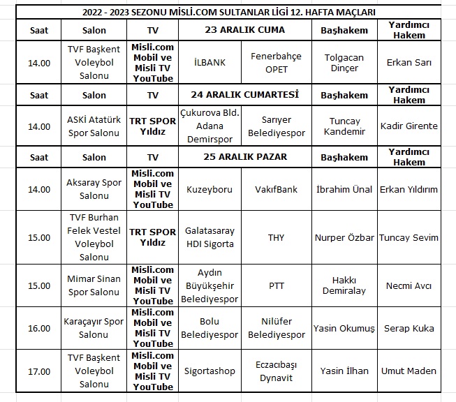 Misli.com Sultanlar Ligi 12. Hafta maçları 23-25 Aralık 2022 tarihlerinde oynanacak.