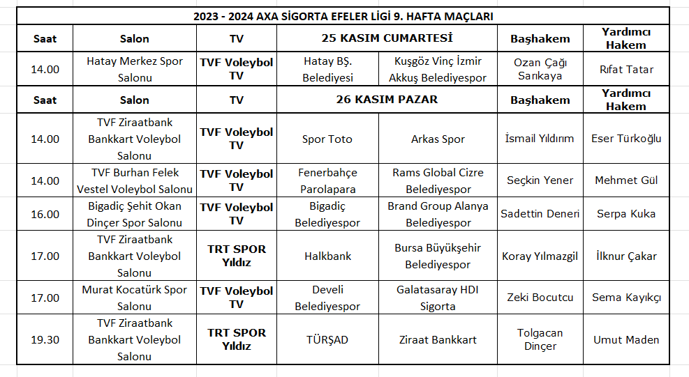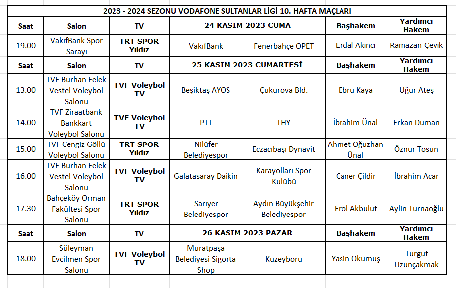 Vodafone Sultanlar Ligi’nde 2023-2024 Sezonu 10. hafta maçları 24-26 Kasım 2023, AXA Sigorta Efeler Ligi 9. hafta maçları ise 25-26 Kasım 2023 tarihlerinde oynanacak.