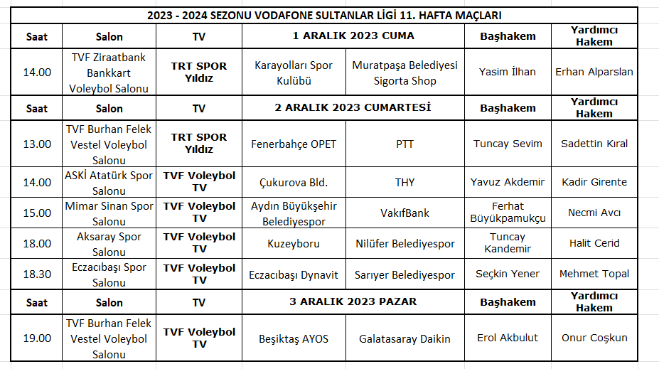 Vodafone Sultanlar Ligi’nde 2023-2024 Sezonu 11. hafta maçları 1-3 Aralık 2023, AXA Sigorta Efeler Ligi 10. hafta maçları ise 2-4 Aralık 2023 tarihlerinde oynanacak.