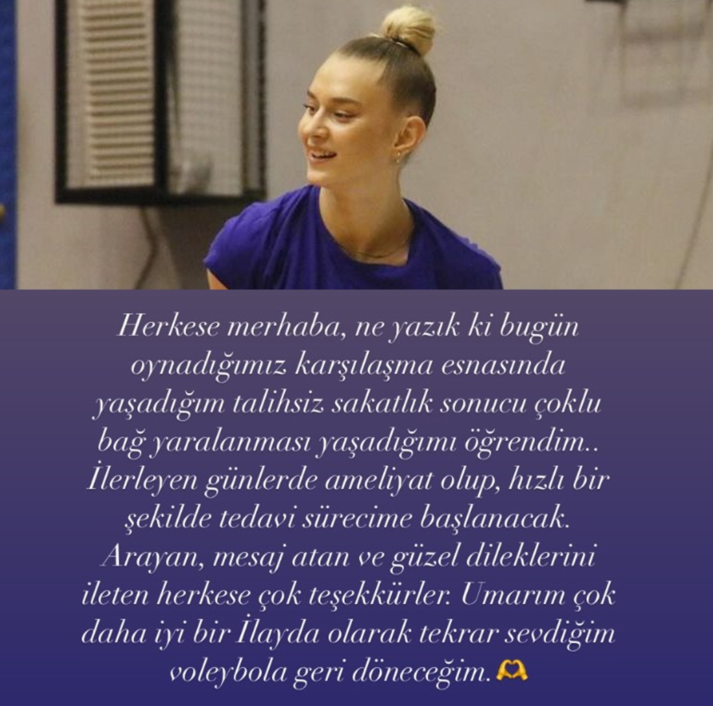 “11 Kasım Cumartesi günü Beşiktaş Ayos ile oynadığımız Vodafone Sultanlar Ligi 7. Hafta karşılaşmasında geçirdiği sakatlık sonucu tetkikleri yapılan sporcumuz Elif Şahin’in ilaç tedavisine başlandığı ve kontrollü olarak çalışmalara başlayacağı planlanmaktadır.”