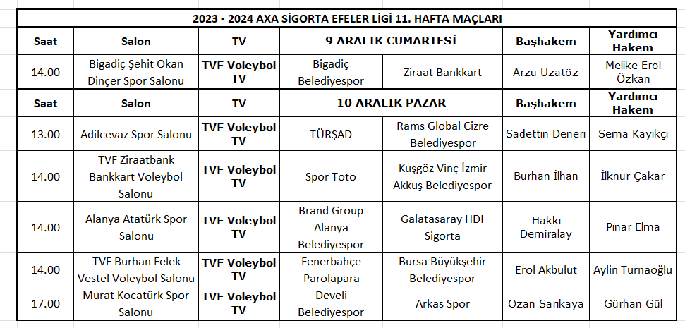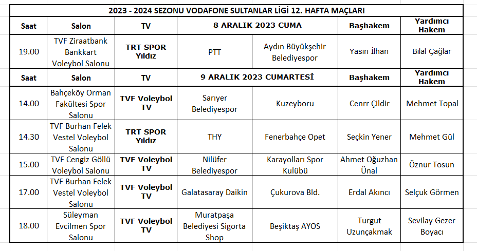 Vodafone Sultanlar Ligi’nde 2023-2024 Sezonu 12. hafta maçları 8-9 Aralık 2023, AXA Sigorta Efeler Ligi 11. hafta maçları ise 9-10 Aralık 2023 tarihlerinde oynanacak.