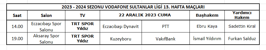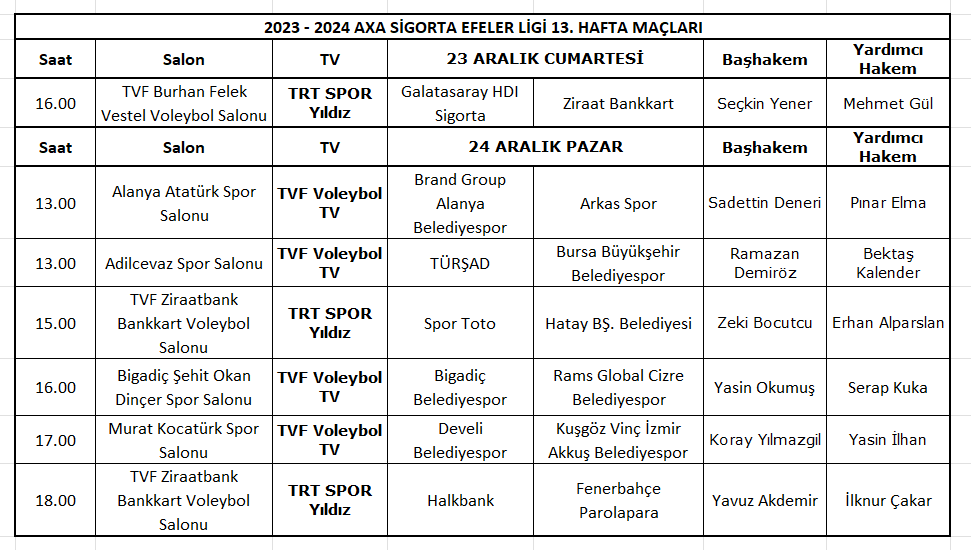 Vodafone Sultanlar Ligi’nde 2023-2024 Sezonu 13. haftanın son iki maçı 22 Aralık 2023, AXA Sigorta Efeler Lig 13. hafta maçları ise 23-24 Aralık 2023 tarihlerinde oynanacak.