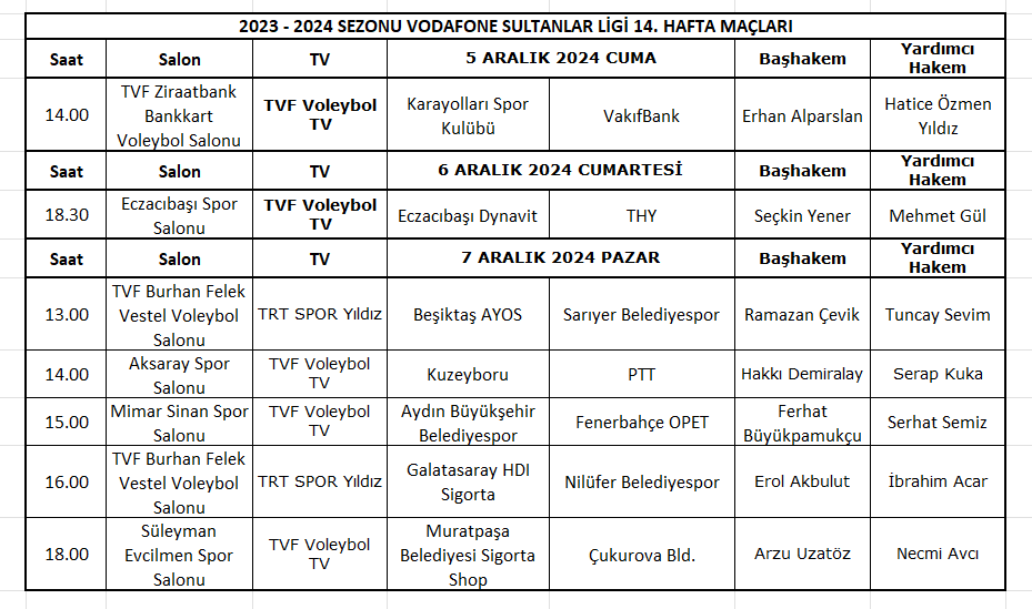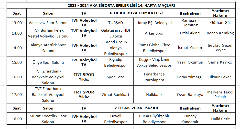 Vodafone Sultanlar Ligi ve AXA Sigorta Efeler Ligi’nde 2023-2024 Sezonu 14. hafta maçları 5-7 Ocak 2024 tarihlerinde oynanacak.