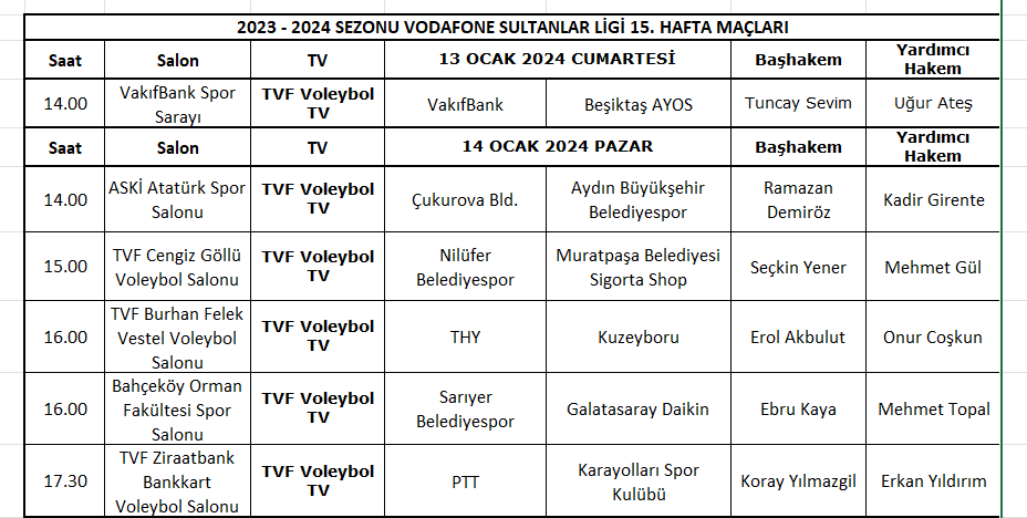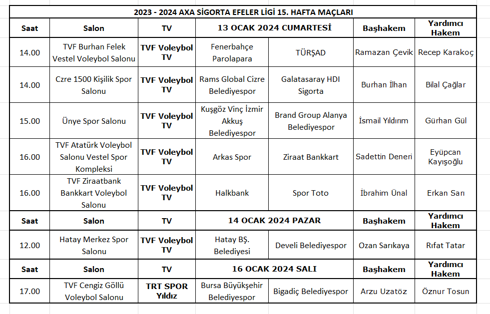 Vodafone Sultanlar Ligi ve AXA Sigorta Efeler Ligi’nde 2023-2024 Sezonu 15. hafta maçları 13-16 Ocak 2024 tarihlerinde oynanacak.