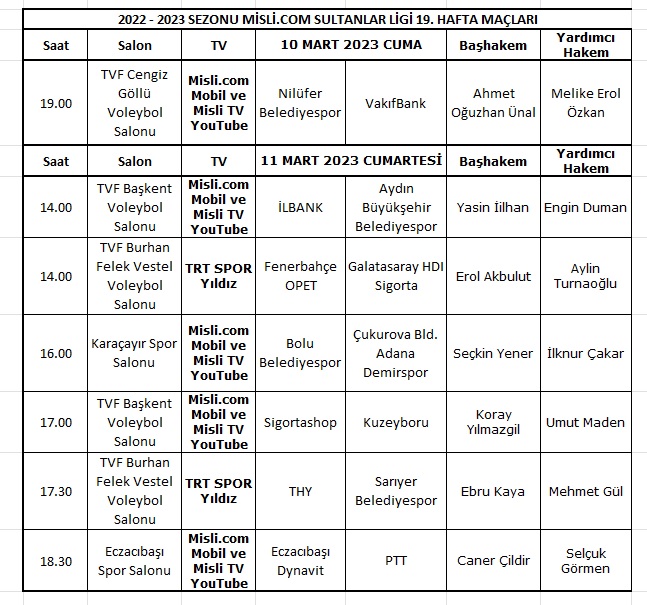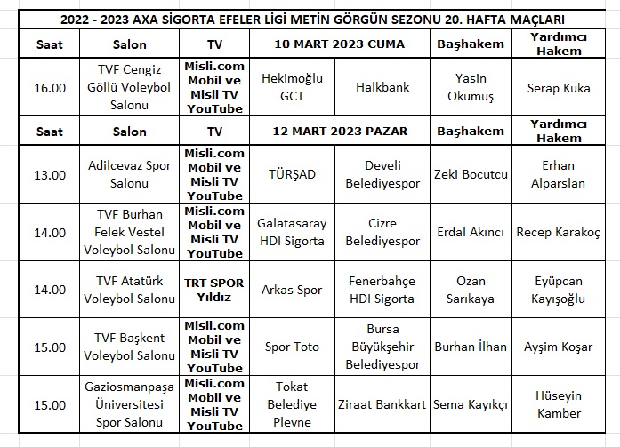 Misli.com Sultanlar Ligi 2022-2023 Sezonu 19. Hafta maçları ile AXA Sigorta Efeler Ligi Metin Görgün Sezonu 20. Hafta karşılaşmaları 10-11-12 Mart 2023 tarihlerinde oynanacak.