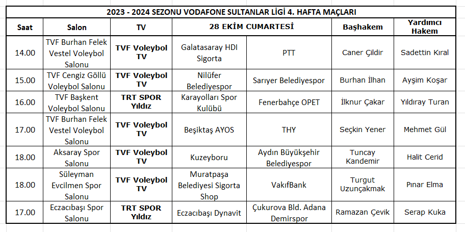 Vodafone Sultanlar Ligi’nde 2023-2024 Sezonu 4. hafta maçları 28 Ekim 2023, AXA Sigorta Efeler Ligi 4. hafta maçları ise 29 Ekim 2023 tarihlerinde oynanacak.