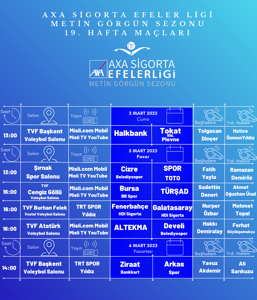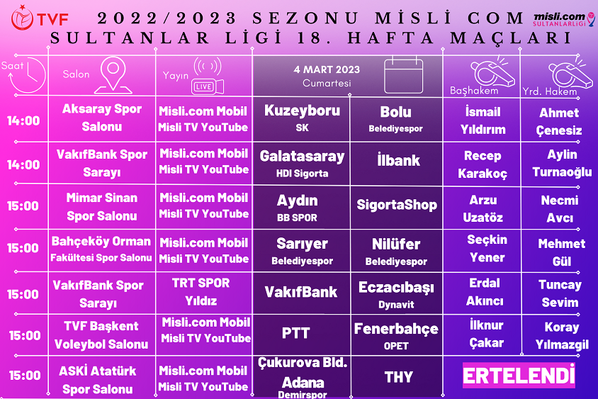 Misli.com Sultanlar Ligi 2022-2023 Sezonu 18. Hafta maçları ile AXA Sigorta Efeler Ligi Metin Görgün Sezonu 19. Hafta karşılaşmaları 3-4-5-6 Mart 2023 tarihlerinde oynanacak.