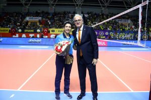 TVF Başkanı Mehmet Akif Üstündağ, Uluslararası Voleybol Hakemimiz Prof. Dr. Nurper Özbar’ı tebrik ederek çiçek takdim etti