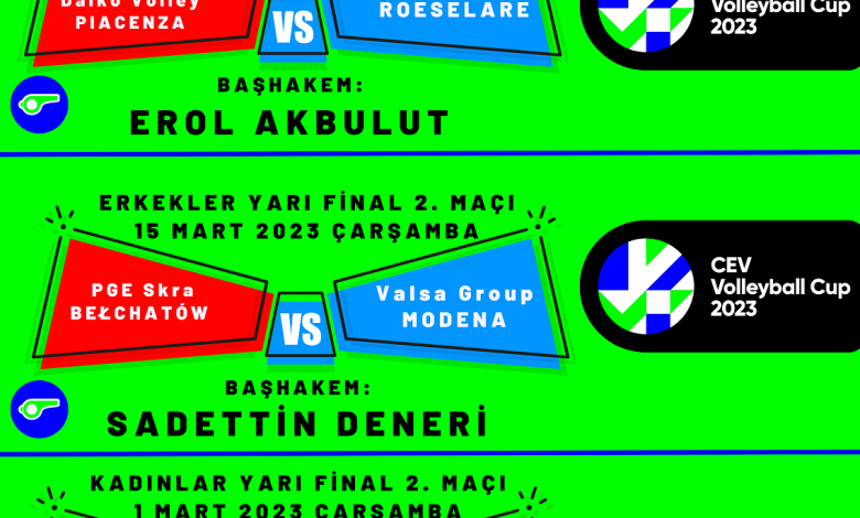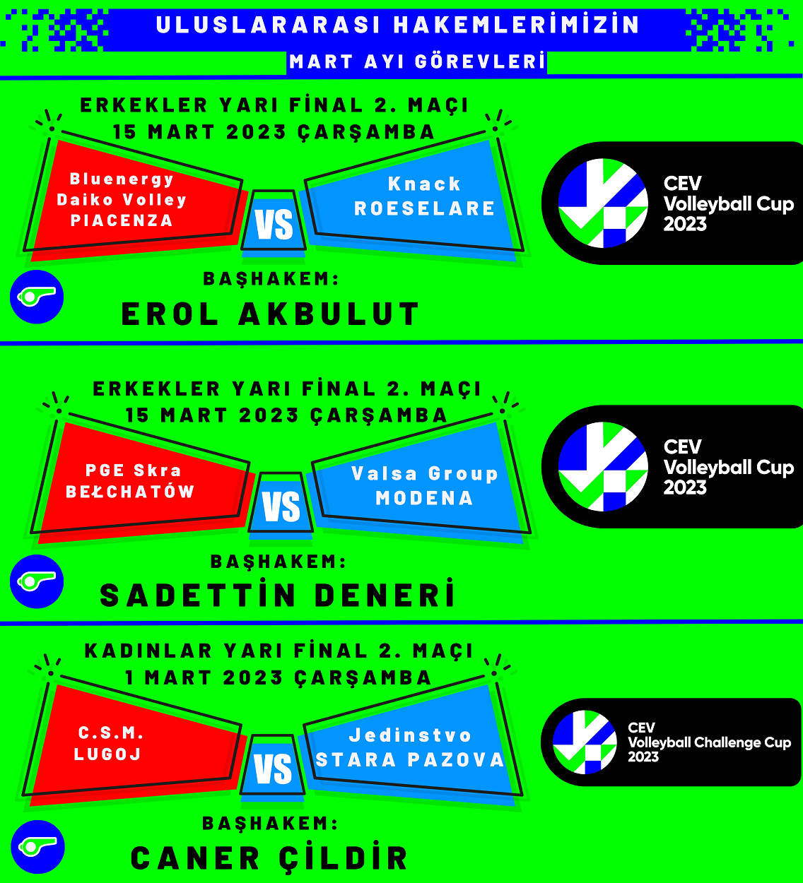 Avrupa Voleybol Konfederasyonu (CEV), 2023 Avrupa Kupalarında Mart ayının ilk yarısında oynanacak 3 karşılaşmada Uluslararası Voleybol Hakemlerimize görev verdi.