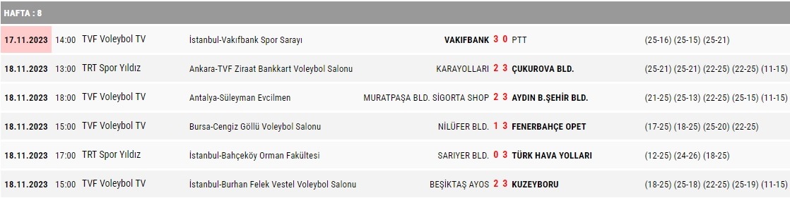 Vodafone Sultanlar Ligi’nin 8. haftasında oynanmış olan maçlar ve sonuçları şöyle: